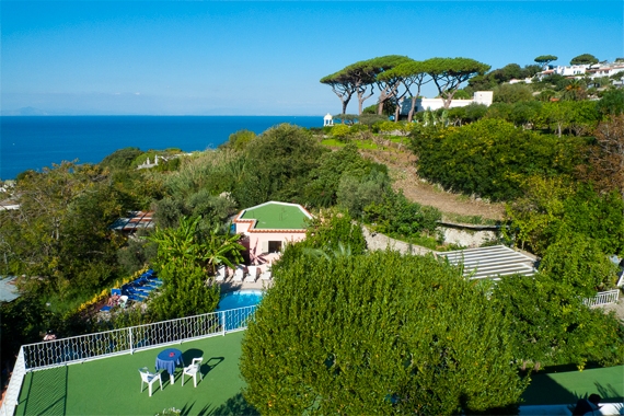 Situato in una cornice paesaggistica di grande impatto, l’Hotel Bel Tramonto domina, da una piccola altura, i centri di Casamicciola e Lacco Ameno. La struttura è stata ricavata in una tipica villa ischitana completamente immersa in un rigoglioso giardino dove gli alberi di agrumi, rappresentanti della vegetazione mediterranea, si alternano ad alberi dalla parvenza più esotica, folti e ombrosi, che invitano a concedersi una pausa relax al fresco, davanti a un panorama veramente indimenticabile. Qui s’incontrano i profumi della macchia mediterranea stemperati da quello tipico del mare che raggiunge l’hotel risalendo i morbidi fianchi della piccola collina sui cui la struttura è adagiata. I tramonti assumono un sapore particolare quando incendiano di rossi e di gialli il cielo e accarezzano, con i riflessi aranciati, la superficie argentea del mare. Proprio il mare qui in questa zona è protagonista, con le sue acque cristalline che lambiscono la Baia di San Montano, (distante circa 4 km dall’hotel) ma senza togliere la scena a una natura prorompente che incornicia di verde il panorama. Una vacanza all’hotel Bel Tramonto è una vacanza all’insegna del totale relax, tra sole, mare e quiete. Ubicato in una posizione particolarmente riservata dai rumori e dal traffico, consente di prendersi una pausa dallo stress quotidiano e di rigenerare corpo e mente in un ambiente molto accogliente, tipico della rinomata ospitalità ischitana, che fa sentire da subito a proprio agio, come a casa.