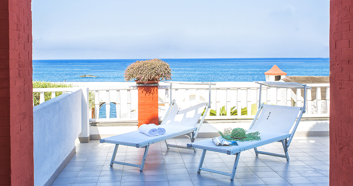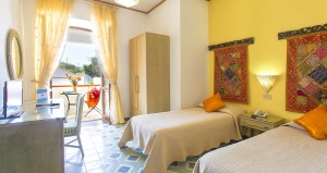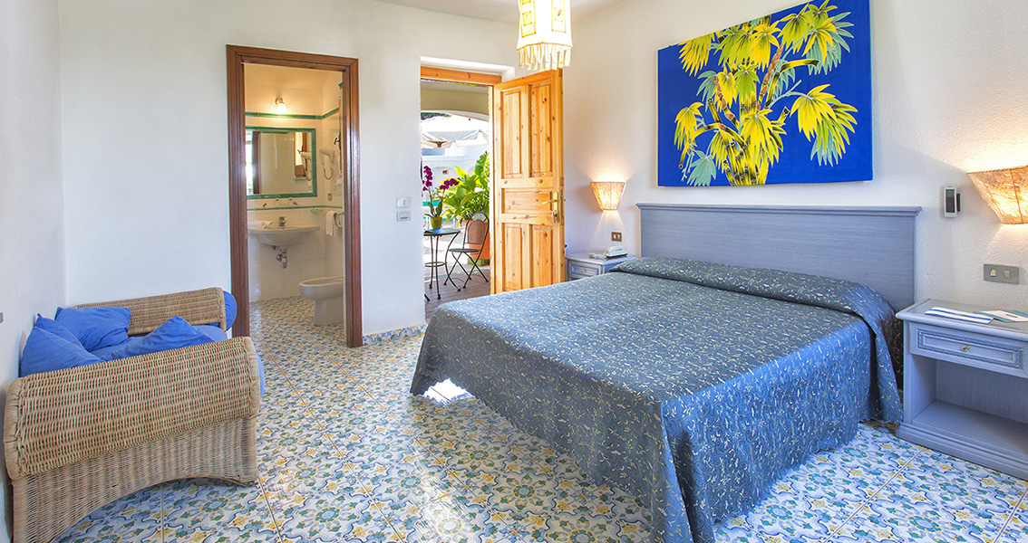 Ampie e luminose, hanno arredi in stile mediterraneo con le tonalità tipiche dell’isola, un richiamo al legno e alle acque termali, semplici e funzionali per l’ospite che voglia rigenerarsi nel totale comfort dopo un’intensa giornata. Il terrazzo o il balcone, si affaccia su panorami unici: il prorompente Monte Eomeo, Punta Caruso e la bella Chiesa del Soccorso. Bagno privato interno, con vasca o doccia, aria condizionata, riscaldamento centralizzato, telefono