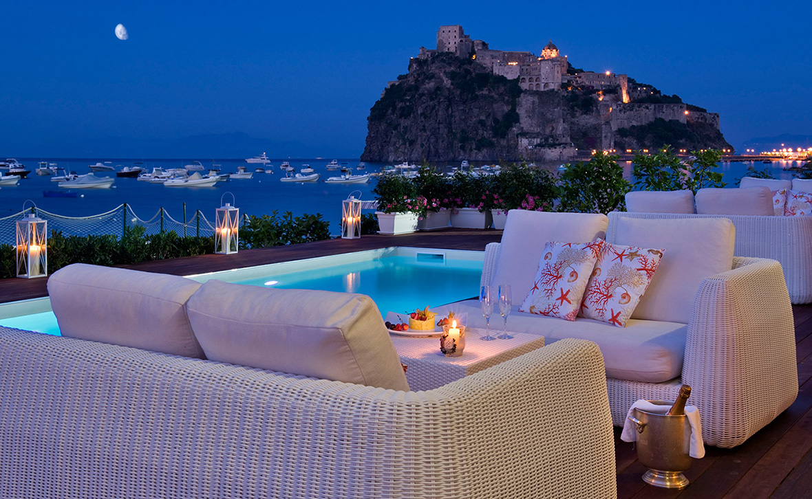La splendida cornice del Castello Aragonese e del meraviglioso mare di Ischia è lo scenario in cui sorge l’Hotel Terme Mare Blu, un’elegante struttura a 5 stelle ricavata in una suggestiva villa patrizia d’epoca, dotata di tutti i comfort e perfetta per una vacanza di lusso indimenticabile. L’albergo è situato proprio nel cuore economico di Ischia, vicinissimo alle più frequentate vie dello shopping, come via Colonna, a circa 200 metri. E sempre a piedi si possono raggiungere tutte le migliori strutture della ristorazione e per il divertimento di ragazzi e adulti.