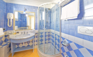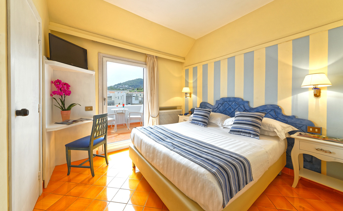 E’ la sistemazione più ampia di tutto l’hotel. Arredata con grande eleganza in stile mediterraneo, è dotata di tutti i comfort quali bagno interno con vasca, doccia, asciugacapelli kit di cortesia. Luminosa e arieggiata è dotata di ben due terrazzi, uno si affaccia sulla storica chiesa di Sant’Antonio e l’altro sul mare e Castel Aragonese.