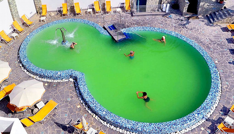 Per quanto riguarda il benessere, l’hotel dispone di due piscine. La più grande, quella esterna, è alimentata da una sorgente termale situata sotto la struttura dell’hotel, e mette a disposizione dei clienti ben 3 getti d’acqua per massaggi cervicali e idromassaggi. Attorno alla piscina l’ampio solarium con sdraio, lettini e ombrelloni. La piscina interna, sempre alimentata da acque termali, è più piccola, molto intima e suggestiva.