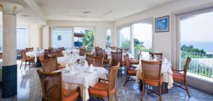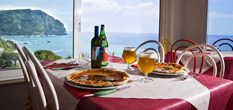 La colazione è a buffet, mentre per il pranzo e la cena si può scegliere tra ben 4 menù, sempre variegati. Interessante il buffet di verdure fresche e di stagione declinate in diverse gustose ricette. Questi piatti non sono solo buoni, sono anche sani perché molta attenzione viene posta nella scelta delle materie prime che andranno a comporre il menù. Non solo, le erbe aromatiche provengono direttamente dal giardino. I piatti sono tutti molto curati e rispecchiano sia ricette della tradizione ischitana e partenopea sia quelle della cucina mediterranea e internazionale, proprio perché la clientela è eterogenea. Piatti gustosi, ma poiché anche l’occhio vuole la sua parte, basterà ammirare lo splendido panorama sul mare di Citara per accontentarlo. Ogni settimana poi si serve il pranzo in terrazza con la vera pizza napoletana, cotta in un forno a legna, e la grigliata di pesce fresco.