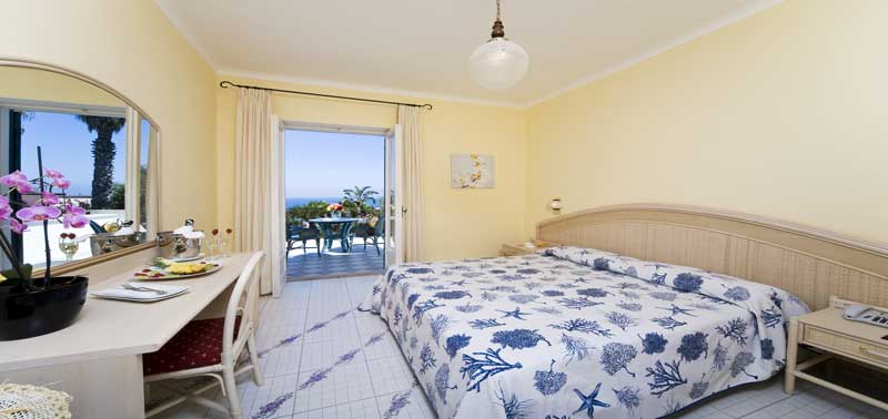 Piacevole e fresco, lo stile mediterraneo si sposa con armonia con la luminosità di ogni sistemazione, regalando ambienti caldi e accoglienti e con un pizzico di romanticismo, particolarmente apprezzato dalle coppie. Per le famiglie vengono offerti anche ulteriori servizi aggiuntivi nelle stanze, come culla o lettino. I dettagli sono importanti, ecco perché tra i comfort si possono annoverare un TV Sat, bagno privato con doccia, asciugacapelli e kit di cortesia, aria condizionata, telefono con chiamata diretta, cassetta di sicurezza. Il balcone ampio si affaccia in alcune sistemazioni sul mare, in altre sul Monte Epomeo e in altre ancora sul verde giardino.