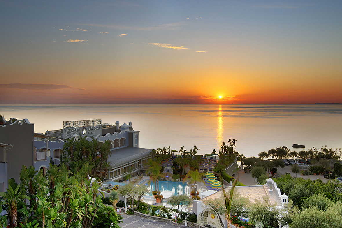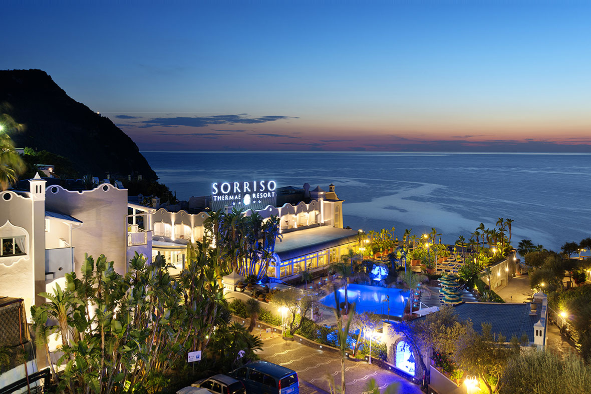 L’Hotel Sorriso Thermae Resort e Spa, 4 stelle, è situato in una suggestiva altura da cui domina la Baia di Citara, nonché i Giardini di Poseidon, nel comune di Forio. Frondosi alberi e verdi palme incorniciano l’hotel che si affaccia proprio su una rupe che schiude un panorama da sogno. Ottima la posizione, dato che l’hotel si trova proprio vicino alla fermata dell’autobus che passa con una certa frequenza: ogni 20 minuti circa. Il centro di Forio dista circa 2 km, mentre la spiaggia di Citara dista pochi minuti a piedi, il sentiero da percorrere è riservato ai soli ospiti e offre scorci davvero preziosi. Sempre dal sentiero privato si può raggiungere anche il parco termale Poseidon. A disposizione una navetta privata per la spiaggia e il parco.