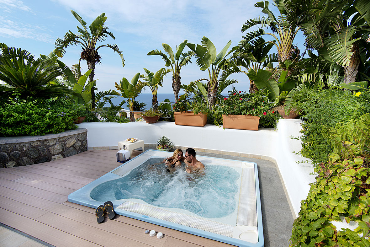 Queste due nuove suites sono state realizzate per soddisfare le richieste degli ospiti più esigenti. La posizione di queste sistemazioni è decisamente vantaggiosa, infatti dispongono di un ampio terrazzo panoramico che consente di dominare tutta la Baia di Citara, regalando preziosi momenti davanti a uno scenario naturale di spettacolare bellezza. Sulla terrazza vi sono comode sdraio e una vasca jacuzzi privata. All’interno gli arredi sono curati fin nei minimi dettagli e rispecchiano sempre il mood dell’hotel. Il bagno privato interno è dotato di una doccia sensoriale cromoterapica, di una vasca a idromassaggio e phon. Rende magica l’atmosfera un caminetto. Tra gli altri servizi un computer con touch screen e connessione internet, quotidiano scelto dall’ospite, colazione in camera, teli per la piscina e infradito più accappatoi e ciabattine per la Spa. Con la prenotazione di queste suite l’ingresso al Percorso Elisir Beauty & Spa è illimitato. Il pranzo e la cena al ristorante Oasis col menù à la carte sono scontati del 20%.
